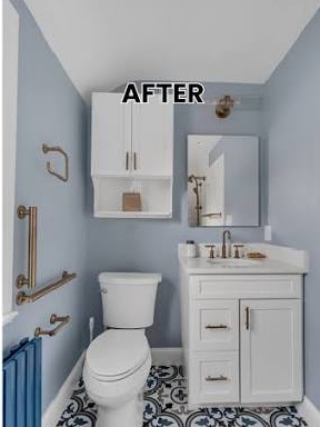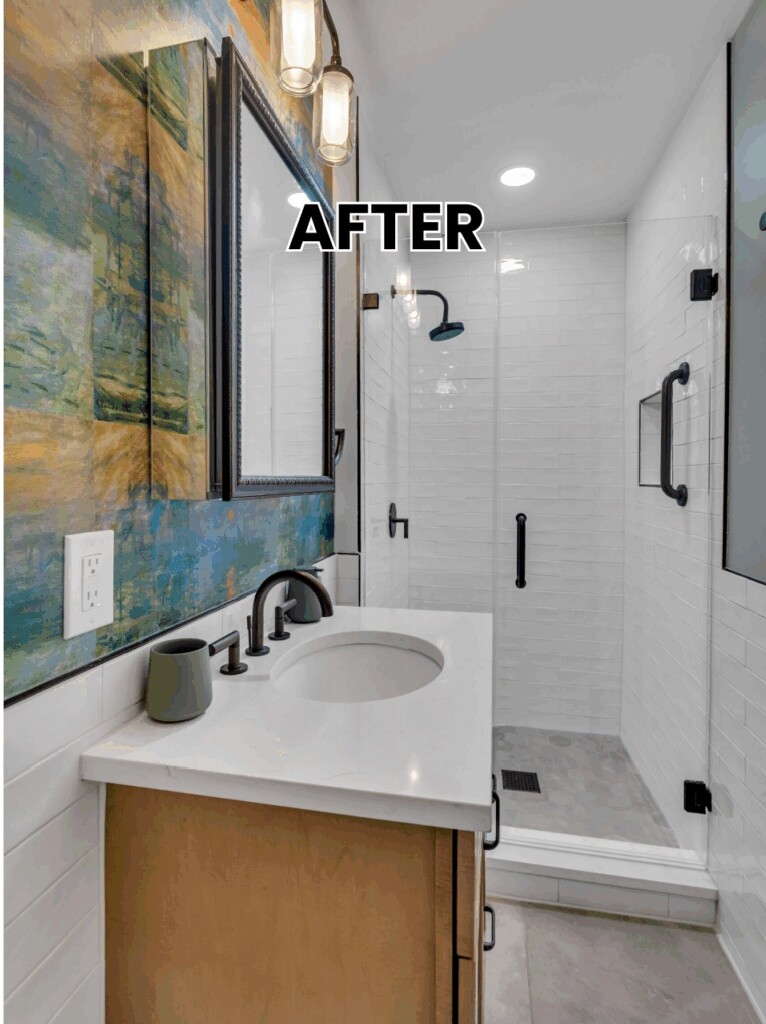 Finished bathroom showing new vanity, lighting, and brighter walls.![]()