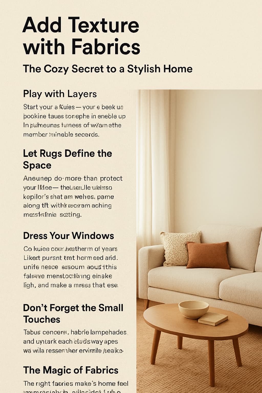 Don’t be afraid to mix things up. Smooth linen pillows against a velvet sofa. A woven jute rug paired with a soft wool blanket. Those contrasts are what make a space feel layered and inviting.