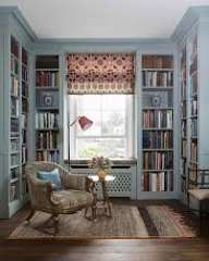 I started by installing built-in bookshelves that stretched from floor to ceiling. To maximize the small space, I added adjustable shelves so I could fit everything from novels to large art books. The shelves were painted a deep navy blue, making the books stand out beautifully.