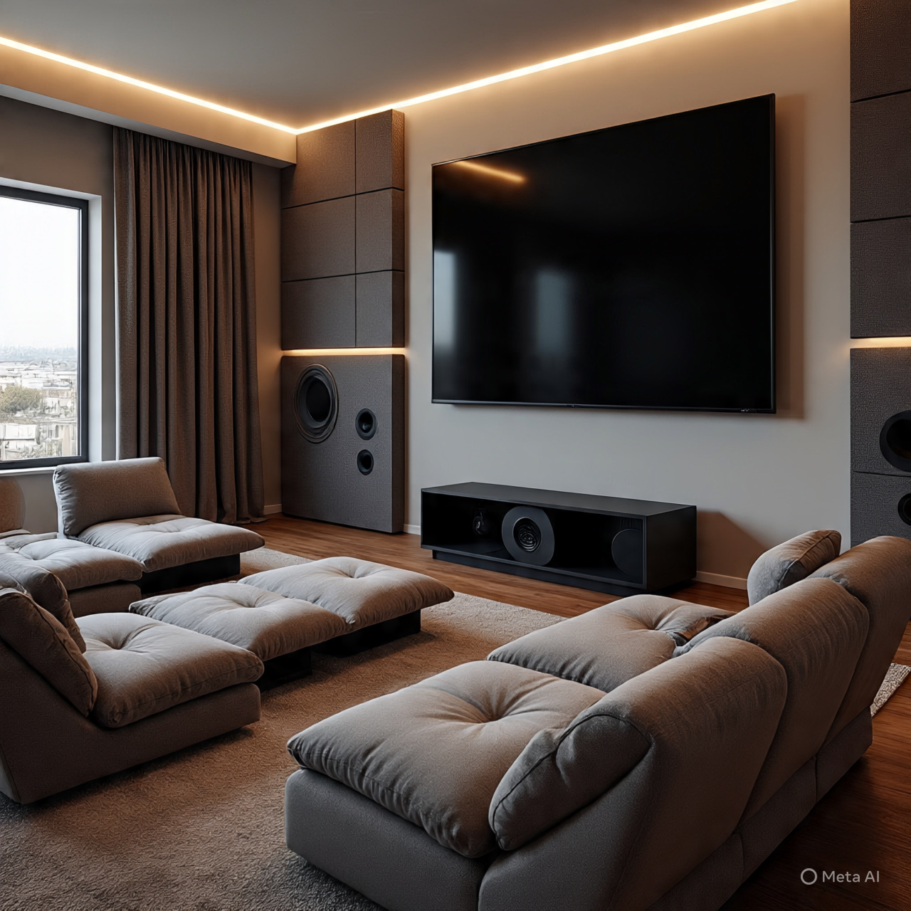 Design aesthetics combine luxury with comfort. Modular seating, recliners with built-in cup holders, and plush rugs create inviting spaces for extended use. Acoustic panels, soundproofing, and strategic speaker placement enhance sound quality while maintaining a clean, stylish look.