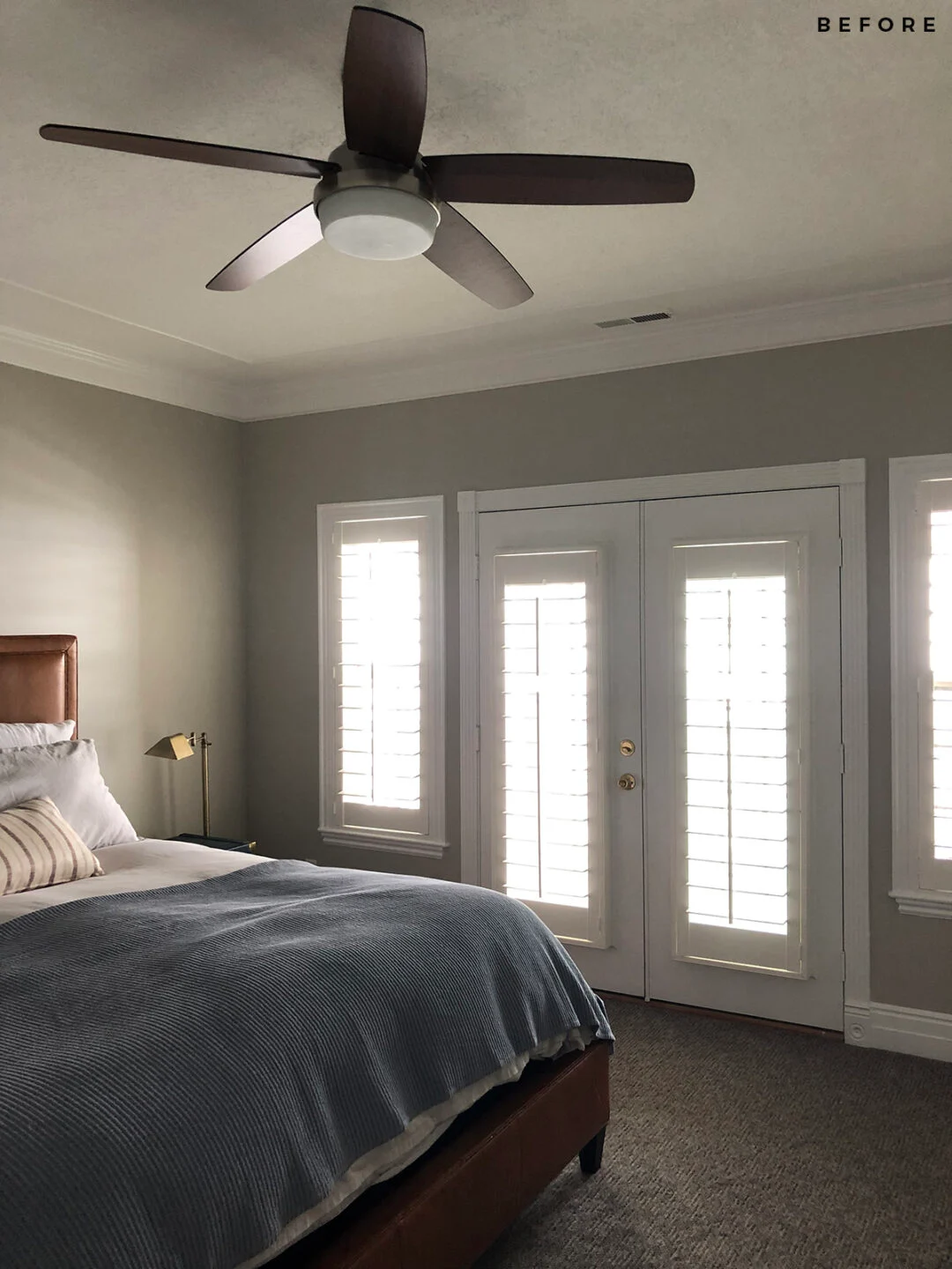 Before photo – plain and cluttered bedroom.