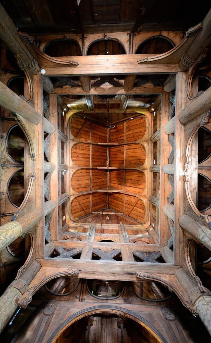 The oak beams are natural and warm-coloured, which helps to attract the viewer to the sky and provides architectural drama without being unpleasant. The design is supported by granite pillars, which have a solid impact and a complex veining that provides structural support as well as weight. Oak and granite combine to produce a strong aesthetic that is both welcoming and stable and combines the beauty of nature with the art of architecture.