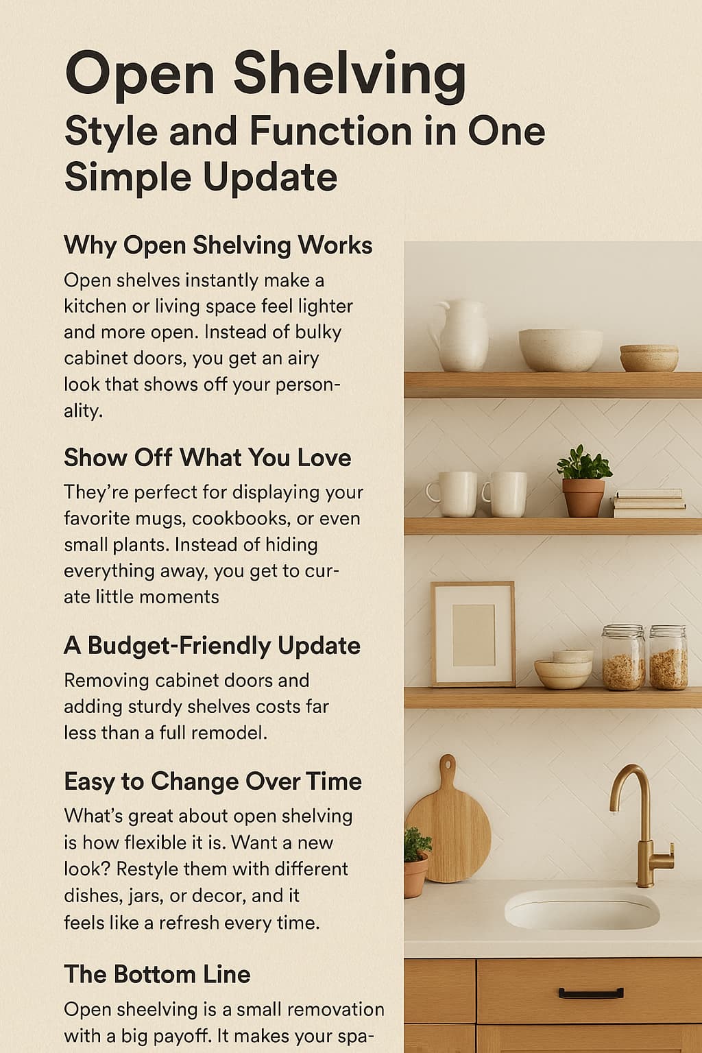 Open shelves instantly make a room lighter and more open. Instead of solid cabinet doors, you get breathing room—and a chance to show off the things you actually love. A stack of pretty dishes, a row of cookbooks, or even a little plant or two suddenly become part of the décor.