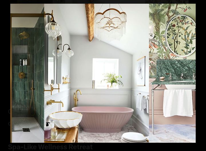 Colors lean toward restorative hues like sage green or terracotta, with oversized sculptural lights and greenery for a calming oasis.