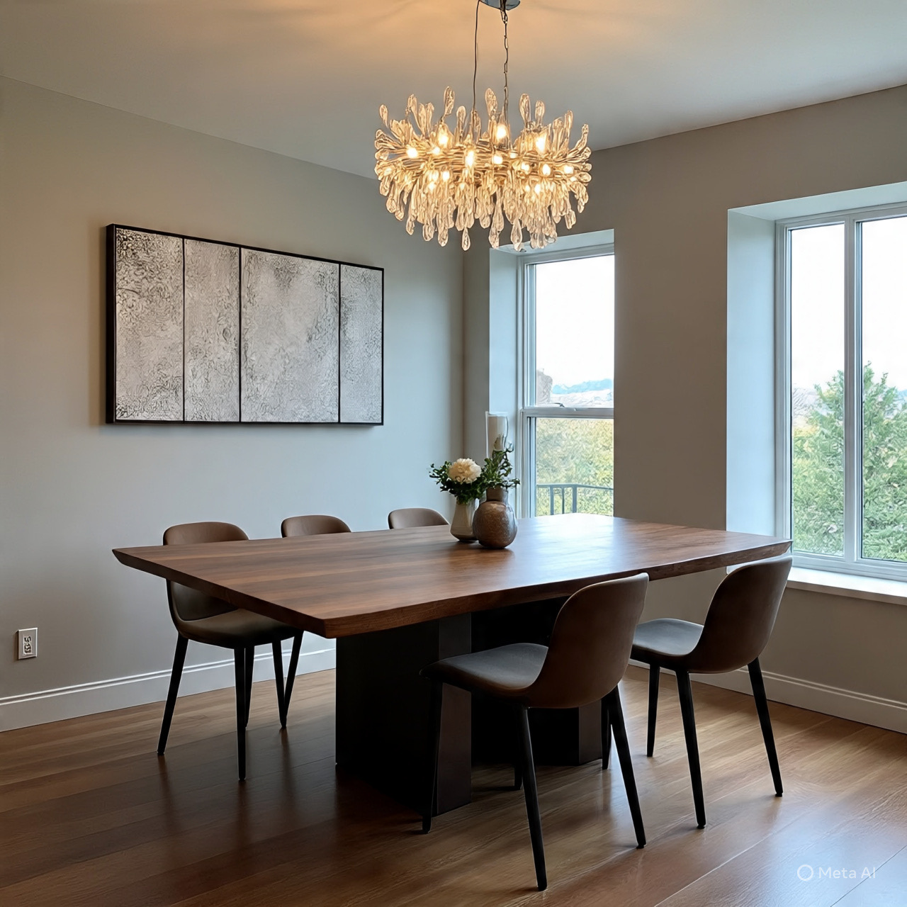 Lighting plays a major role in creating atmosphere. Large windows allow natural light to fill the space, while pendant lights or chandeliers provide focus over tables. Layered lighting, including wall sconces and accent lights, enhances ambiance and functionality for evening meals or entertaining guests. Adjustable lighting creates flexibility for various occasions.