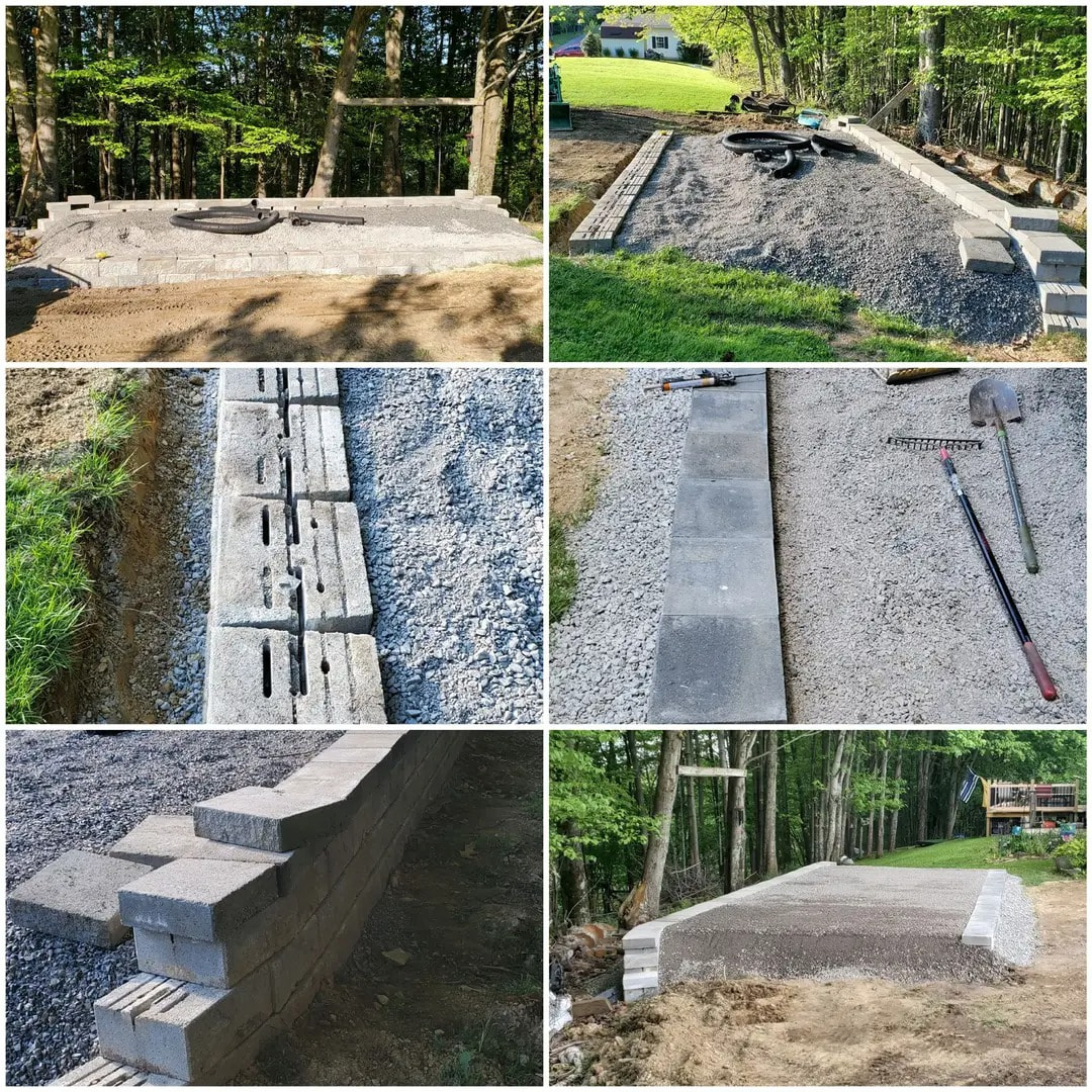 Mid-construction photo showing gravel, drainage, or blocks being stacked.![]()