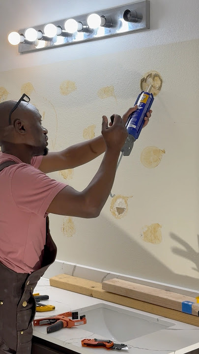 During renovation – installing mirror and light fixture.