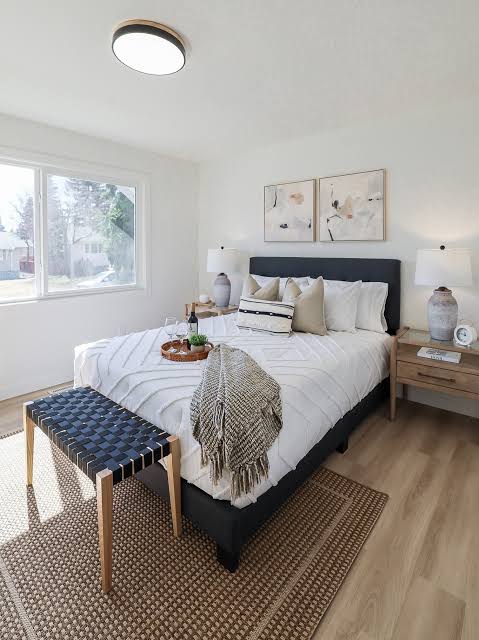 The seller decided to make a few small changes. They added soft lighting, swapped the old curtains for airy ones, and staged the room with cozy bedding and a couple of plants.
