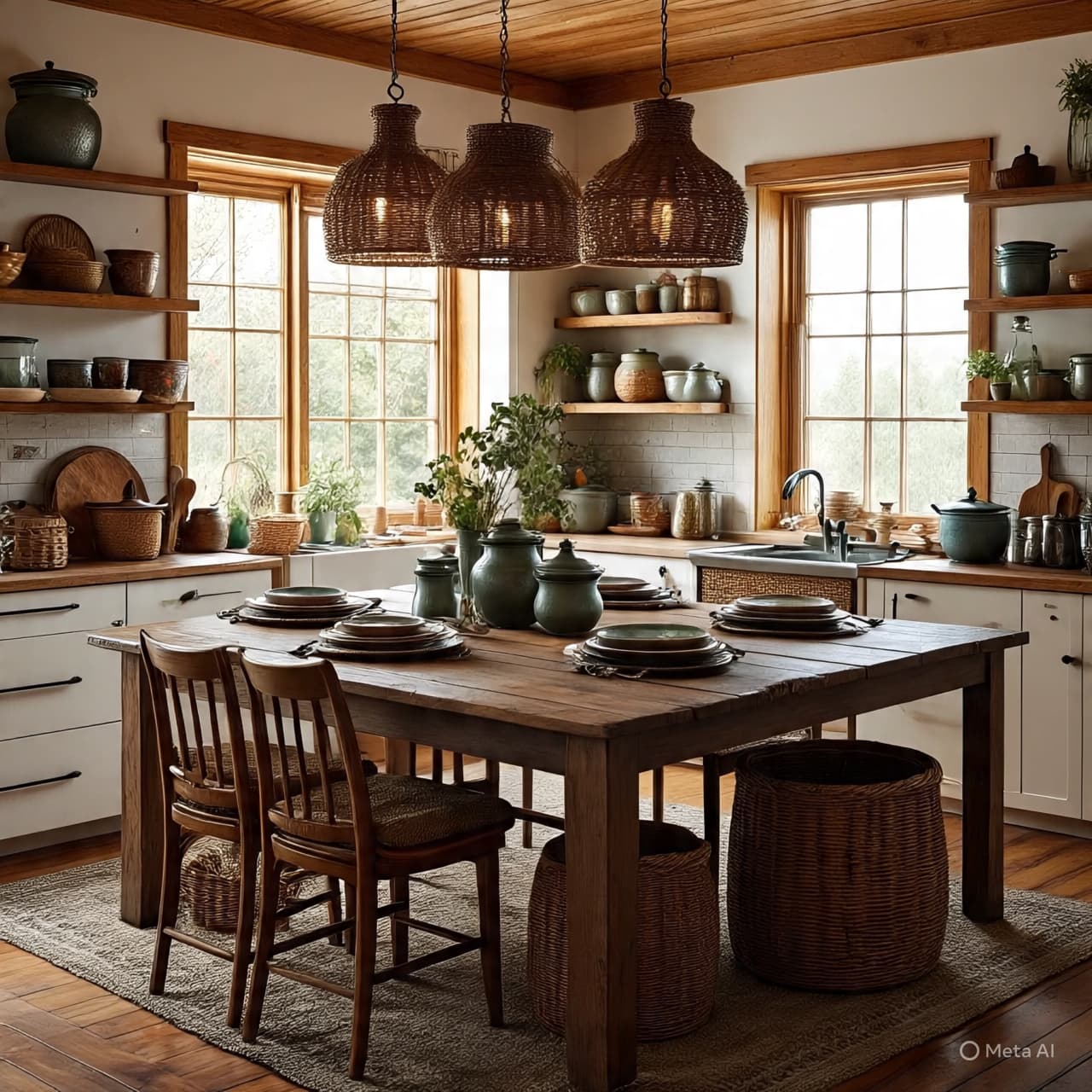 Wood is one of the most defining features of farmhouse interiors. Exposed beams, reclaimed wood tables, and wide plank floors give spaces warmth and authenticity. Combined with neutral colors like cream, white, and beige, the wood tones create a soft, welcoming backdrop that feels timeless.