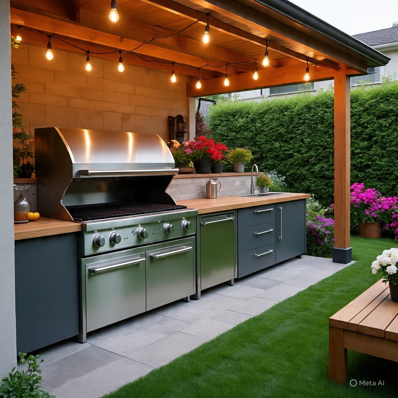 Appliances vary depending on budget and preference. Grills remain the most common feature, but many outdoor kitchens also include sinks, refrigerators, and even pizza ovens. Lighting extends usability into the evening, while pergolas or canopies provide shade and protection. The quirky tip is to install a small herb garden next to the cooking area. Fresh herbs not only add flavor to meals but also create pleasant aromas and a natural atmosphere.