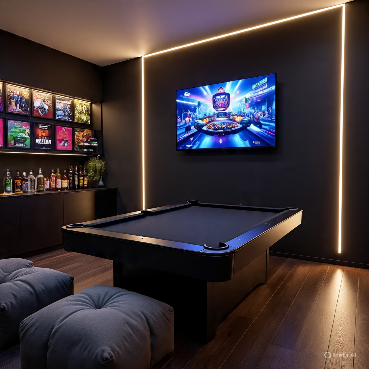 Lighting also plays a big role. Overhead pendant lights work perfectly above pool tables, while softer, adjustable lighting sets the mood for video gaming or watching movies. Adding LED strips along shelves, under counters, or behind screens creates a cool, modern vibe that feels both fun and immersive.