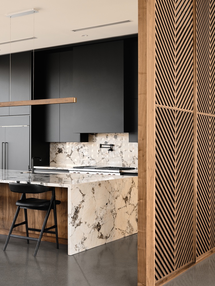 Walnut shelving has a rich sound and adds a sense of depth, cosiness and elegance to interiors, which is perfect in displaying books, art work, or decorations. The limestone backdrops behind it provide a light contrast of softness and lightness with slight textures and earthly colours that accentuate the richness of the walnut. The combination of them makes an aesthetically harmonious image that is sophisticated and eternal.